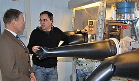 Mit 40 Millionen Euro wird daher die Forschung des Zentrums pro Jahr unterstützt. Alleine sechs Millionen Euro gibt das Land für die Erweiterung des Batterieforschungsbereichs elab am Standort Ulm. Das Vorstandsmitglied Prof. Dr. Werner Tillmetz und der wissenschaftliche Mitarbeiter Reiner Sturm (im Bild) erläuterten Hans-Peter Storz, wie das Zentrum die Landesmittel verwendet.